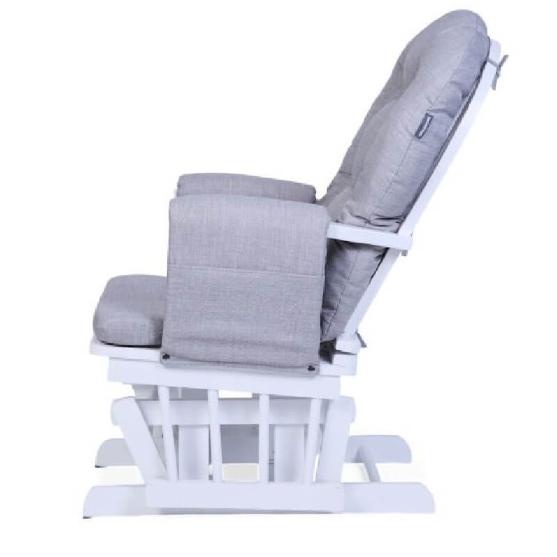 Miękkie, grube poduszki otulają ciało, a tapicerowane podłokietniki zapewniają stabilne wsparcie nawet podczas długich chwil z maluszkiem. Białoszara kolorystyka oraz eleganckie wykończenia z drewna bukowego nadają całości ponadczasową estetykę.