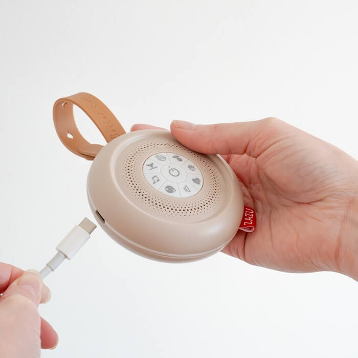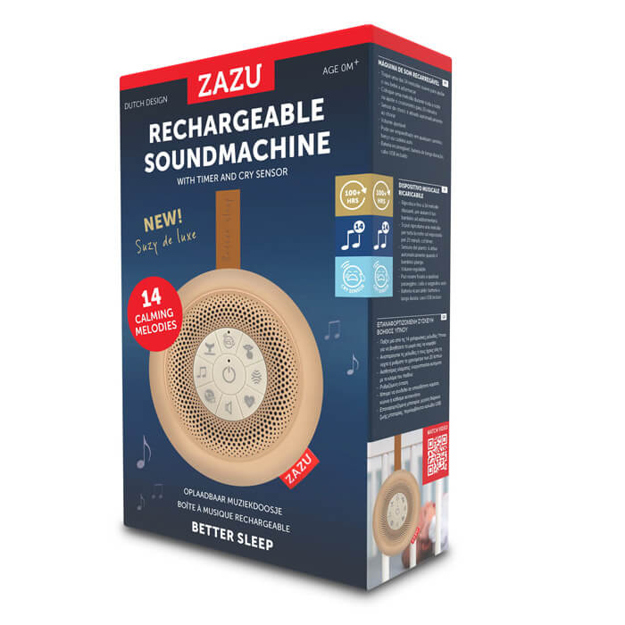 Usypianka przenośna SUZY odgrywa dźwięk bicia serca, uciszania, biało-różowy i brązowy szum, 2 melodie relaksacyjne, 4 kołysanki i 3 różne dźwięki oceanu. Dźwięk może być odtwarzany ciągle lub automatycznie się wyłączyć po 20 minutach.